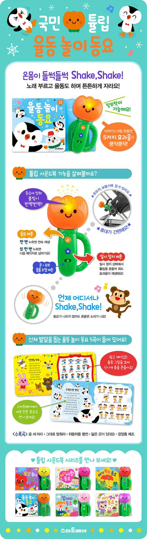 노래 부르고 율동도 하며 튼튼하게 자라요! 영유아 베스트 동요 사운드북 ‘튤립 사운드북’의 또 다른 시리즈 율동 놀이 동요 가 새로 나왔어요! 귀여운 튤립 모양의 마라카스를 손으로 잡고 흔들며 신나는 율동도 따라해 보아요. ‘튤립 사운드북’ 시리즈는 소리에 민감하게 반응하는 영아들을 위한 감각 자극 사운드북으로, 갖고 싶은 동요 사운드북 1위에 오른 엄마들의 필수 육아 아이템입니다. 튤립 모양의 마라카스가 책과 분리되어 노랫소리에 맞춰 흔들면 불빛과 함께 다양한 효과음이 흘러나와 아기들의 눈과 귀를 사로잡지요. 또 한 번 아기들의 마음을 훔칠 따끈따끈한 율동 놀이 동요 를 소개합니다. 율동 놀이 동요 에는 신체 발달을 돕는 흥겨운 율동 놀이 동요 5곡이 들어 있어요. 쉽고 재미있는 율동 그림을 보며 신나게 몸을 흔들다 보면, 대근육과 소근육이 발달할 뿐 아니라 신체 표현력까지 쑥쑥 자라납니다. 특히 율동 놀이 동요 에서 처음 선보이는 동요 ‘뒤뚱뒤뚱 펭귄’은 중독성 있는 멜로디와 귀여운 아기 펭귄의 율동이 돋보이는 창작 동요로, 유튜브에서 영상으로도 만날 수 있습니다. 율동 놀이 동요 와 함께 신나게 노래 부르고 율동도 하며 튼튼하게 키워 주세요.